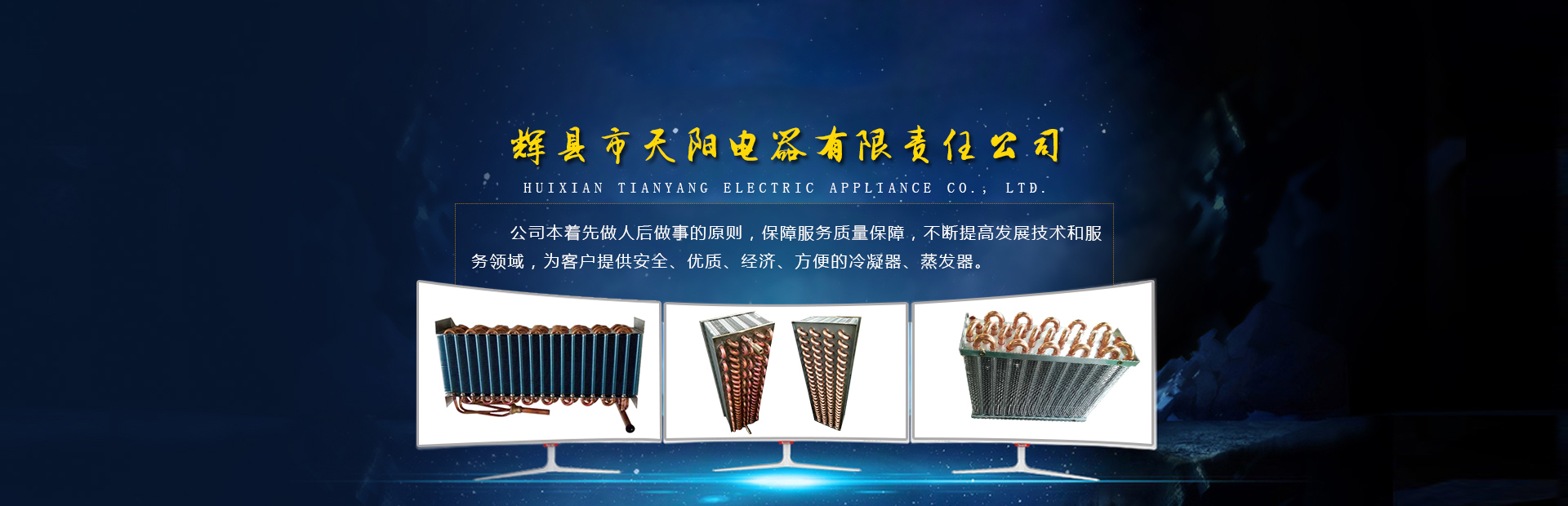 輝縣天陽電器有限責(zé)任公司位于肥沃的中原河南省輝縣市學(xué)院路中段工業(yè)集聚區(qū)興業(yè)園3號廠房,以制冷設(shè)備用冷凝器,蒸發(fā)器,熱交換器為主。主要材料為銅管鋁翅片,銅管銅翅片,鋁管鋁翅片。廣泛應(yīng)用于冰箱冰柜,制冷設(shè)備,暖通設(shè)備,空調(diào),自動售貨機(jī),冷干機(jī),超市立風(fēng)柜,冷藏車,烘干機(jī)等產(chǎn)品領(lǐng)域。  公司自1998年成立以來,始終堅(jiān)持:“科技造就產(chǎn)業(yè)、質(zhì)量成就信譽(yù)、誠信鑄就輝煌”的質(zhì)量方針,從產(chǎn)品拓展上堅(jiān)持“人無我有,人有我優(yōu),人優(yōu)我特的”經(jīng)營理念,25年來,從1998年開始供應(yīng)河南冰熊集團(tuán)下屬的冷柜廠,制冰機(jī)廠各種冷凝器;2003年之后,原冰熊集團(tuán)的精英志士開始在全國各地發(fā)展,所到之處依托我公司供貨,以致于多家目前已具行業(yè)中佼佼者的公司,從而建立了如凱雪公司,兆邦公司、凌云公司、海寶公司、正雪公司、上海忠云、山東德萊維等幾十余家公司在草創(chuàng)時期的啟蒙供貨商,友好共贏長達(dá)十余年,成為我國制冷行業(yè)的供應(yīng)商。以致在2015年初雙匯集團(tuán)面向社會的招標(biāo)書中指名要我公司冷凝器、蒸發(fā)器指定產(chǎn)品供應(yīng)商